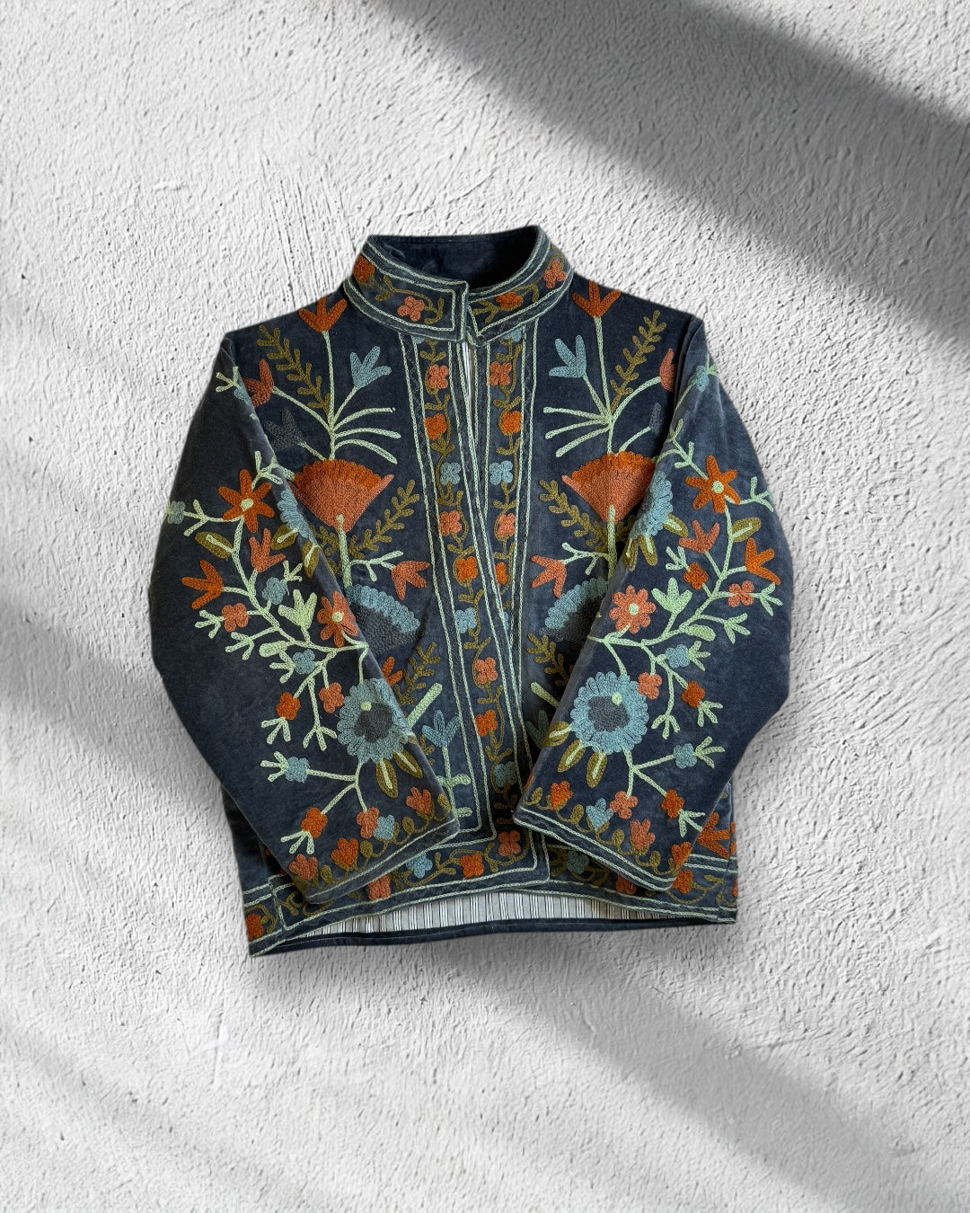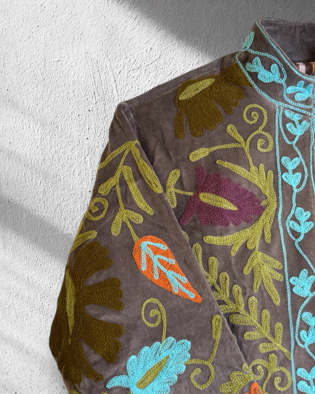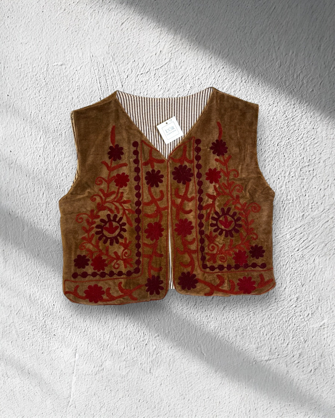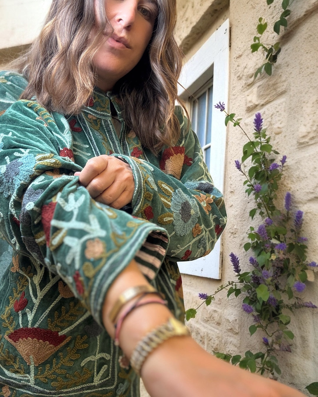 Un accessorio versatile che unisce artigianalità e colore. Queste pochette in velluto, interamente ricamate a mano con motivi floreali e geometrici, sono rifinite da una nappina in filo per un tocco boho-chic.