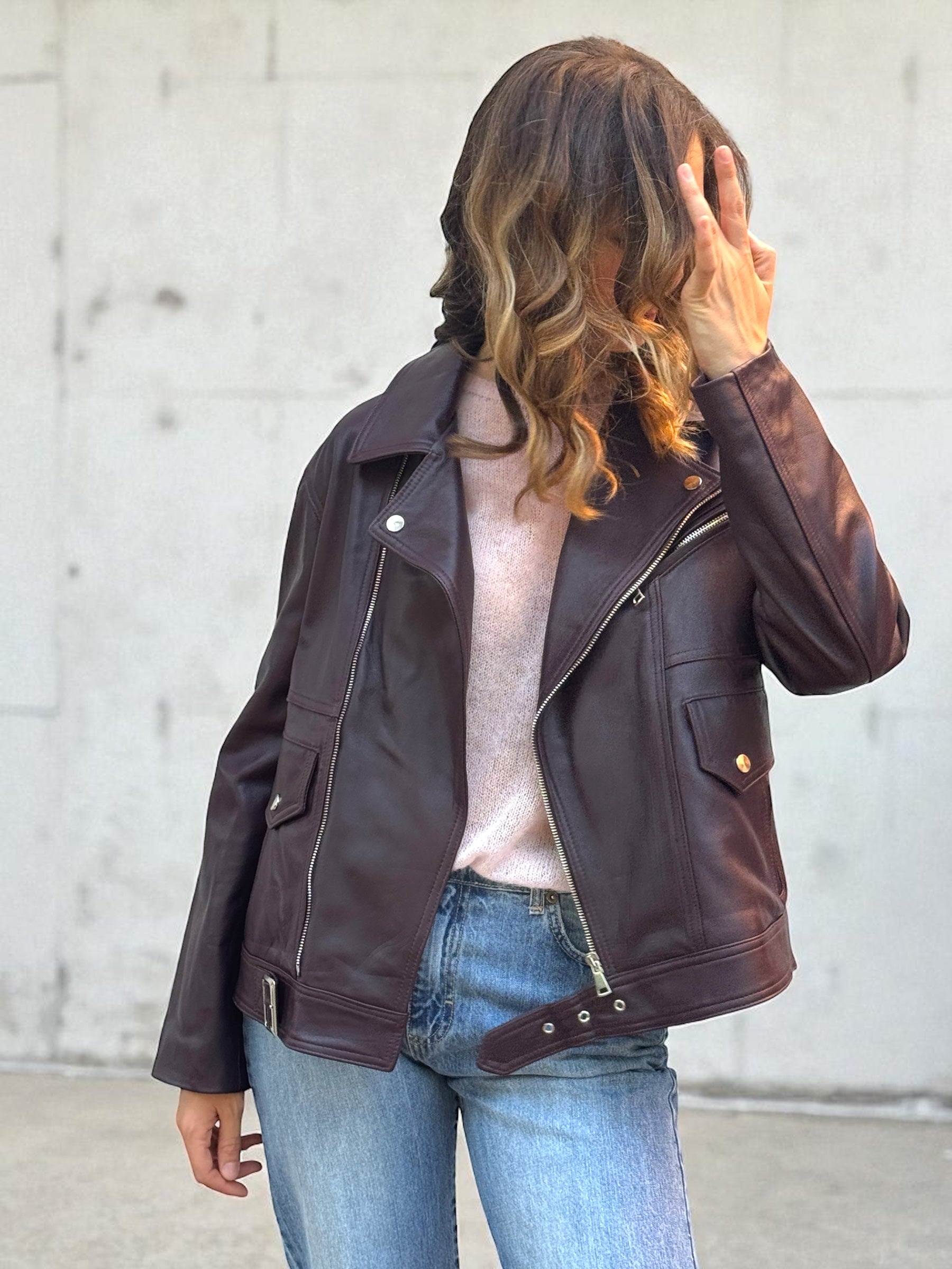 Un lampo di ribellione con l’eleganza di una sfumatura inattesa: questa giacca in pelle bordeaux reinterpreta il chiodo classico con un twist sofisticato. La silhouette iconica — zip diagonale, revers strutturati e cintura regolabile — incontra un colore intenso, profondo, quasi vinoso, che cattura la luce in modo sorprendente. Non è il solito nero, non il solito marrone: il bordeaux dona carattere e raffinatezza, trasformando un capo nato per la strada in un alleato perfetto per look urbani, audaci e consapevoli.