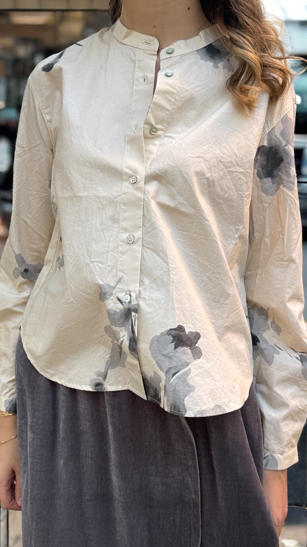 Il fit dritto e la struttura classica in denim contrastano con l’opulenza del pattern, creando un equilibrio perfetto tra femminilità romantica e attitude grintosa.